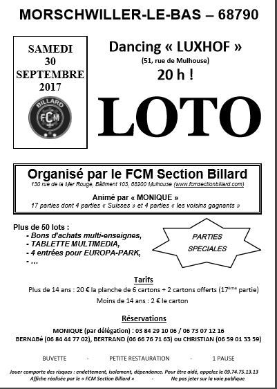 Ce 1er loto de la saison 2017-2018 sera entièrement organisé par le FCM Section Billard :