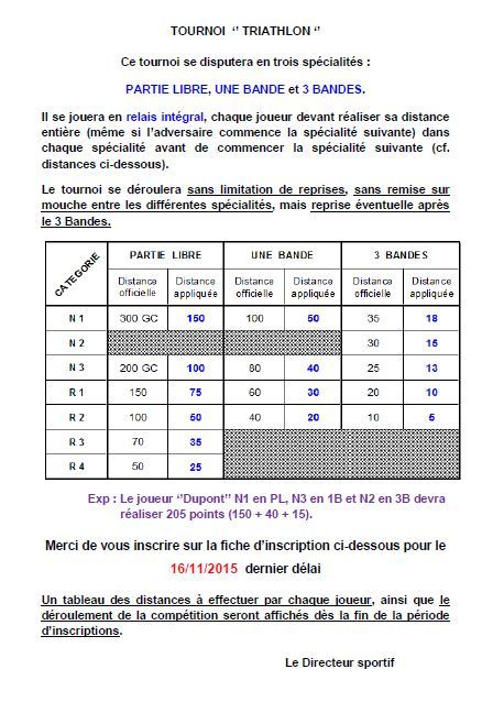 Le tournoi se déroulera sans limitation de reprises, sans remise sur mouche entre les différentes spécialités, avec reprise éventuelle après le 3 Bandes.