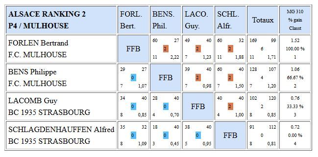 - en R1: Suat AKTAS finit 3ème à BENFELD alors qu'à domicile Bertrand FORLEN remporte le ranking (avec une moyenne générale de 1,707) devant Philippe BENS: avec maintenant 18 points chacuns, Bertrand et Philippe sont très bien placés pour se qualifier pour la finale d'Alsace.