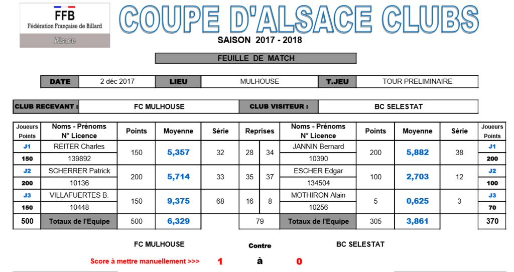 Ce samedi 2 décembre 2017, l'équipe du FCM Section Billard a rencontré celle de SELESTAT dans le cadre du tour préliminaire de la coupe d'Alsace.